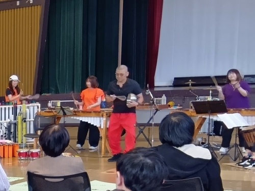 太鼓やマラカスのほか、身近にある道具を楽器にして奏でており