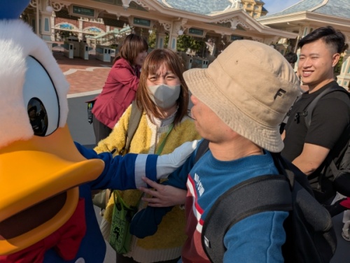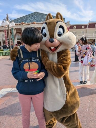 ミッキーの形をしたかわいい花壇の前で集合写真を撮影していると、「チップ」や「ドナルド」が迎えてくれました。